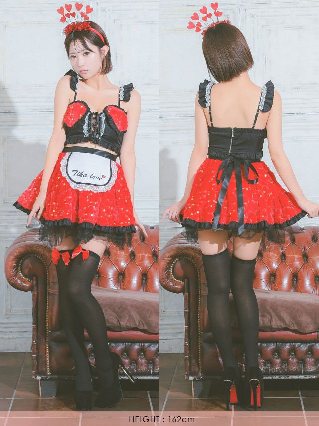 コスプレ フリルスパンコール付きふわもこバストレースアップへそ出しフレアスカートペアセクシーメイドのサイズ表