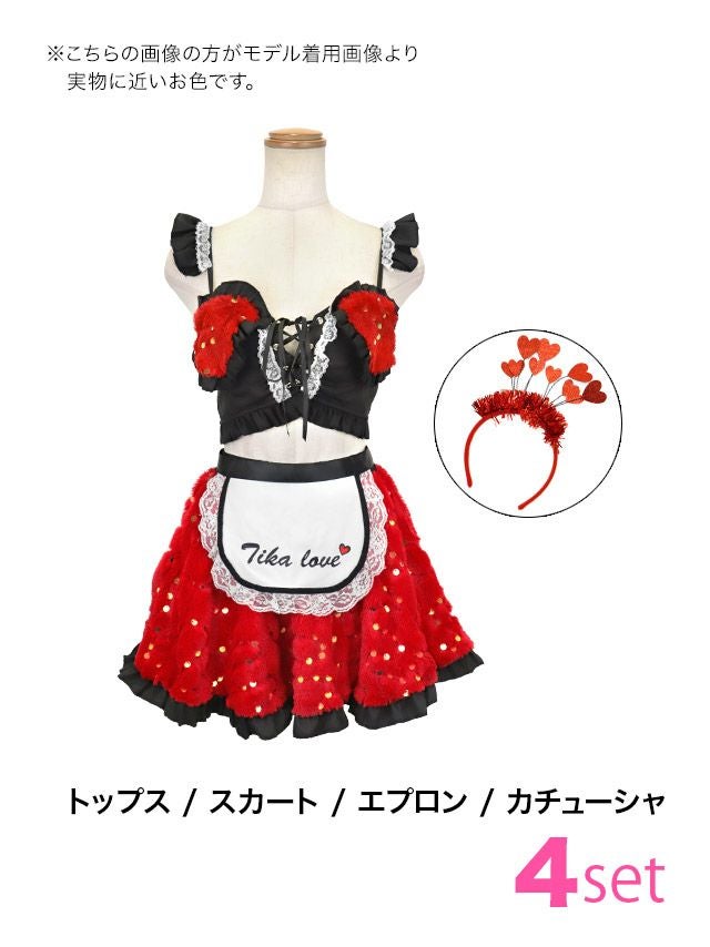 4. [セール]コスプレ フリルスパンコール付きふわもこバストレースアップへそ出しフレアスカートペアセクシーメイド [4点セット] (トップス/スカート/エプロン/カチューシャ)(S~L)