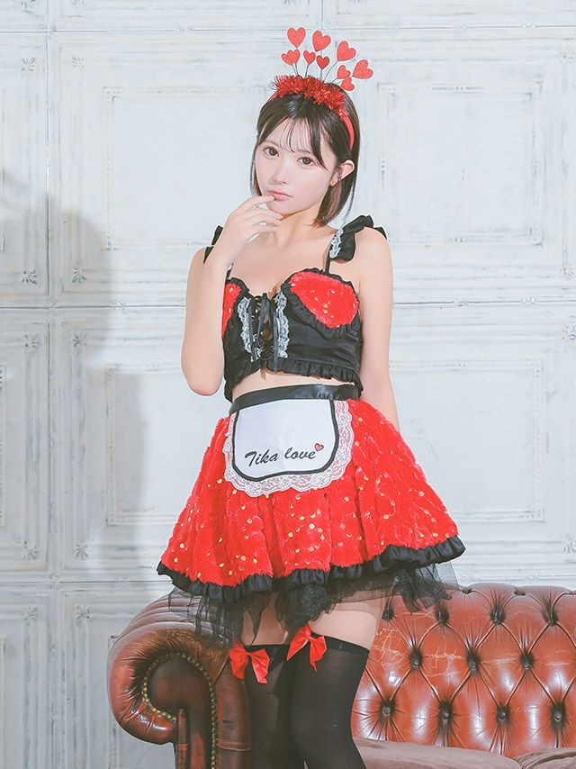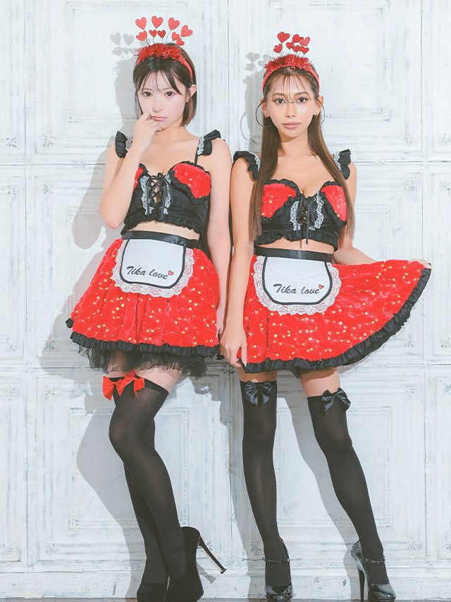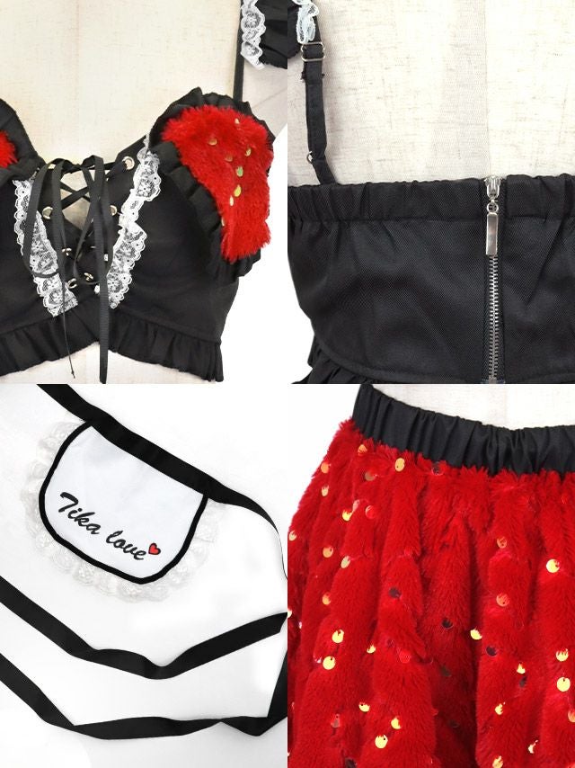 コスプレ スパンコール付きふわもこバストレースアップフリル袖へそ出しフレアスカートセクシーメイドのセット内容