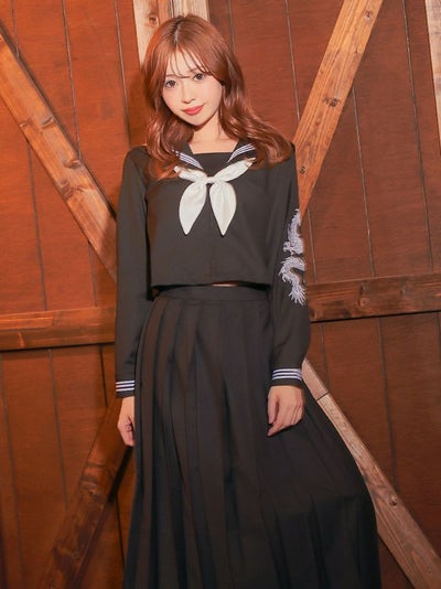 スケバン風 袖あり 体型カバー 龍刺繍入り ロング丈 プリーツ セーラー服