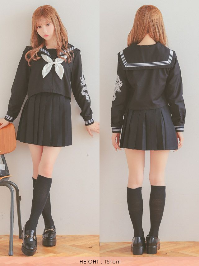 3. [セール][再入荷] コスプレ ドラゴン刺繍入り ミニ丈 体型カバー 袖あり プリーツ フレアスカート セーラー服 [4点セット] (セーラー服上下/スカーフ/ソックス)【10月下旬発送予定】