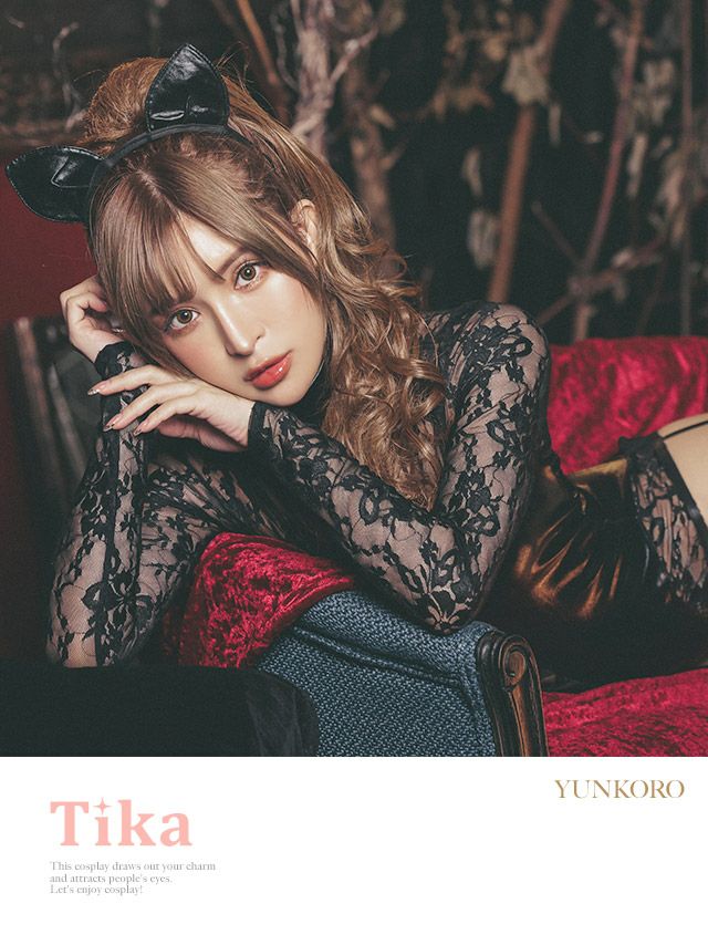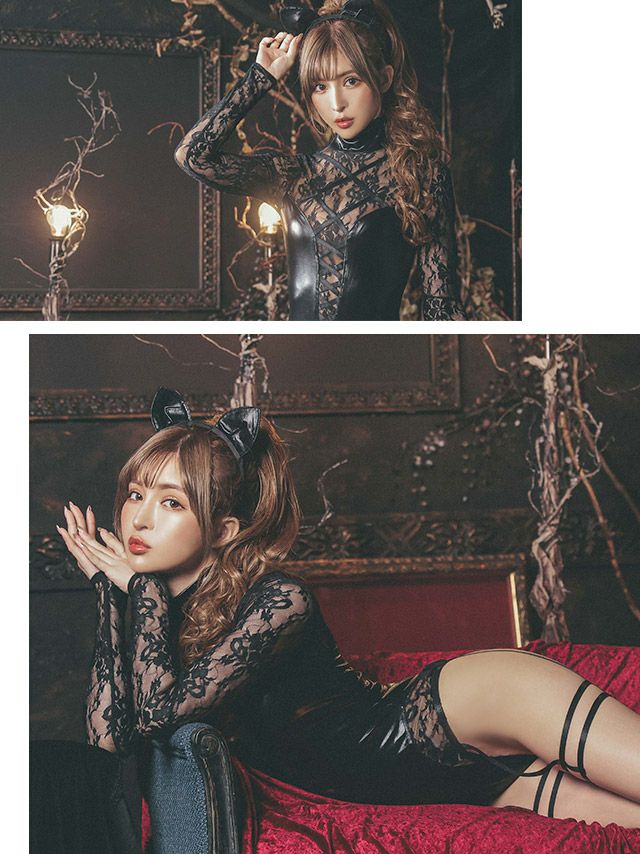 4. コスプレ フラワーレース袖ありセクシー黒猫エロかわアニマル [2点セット] (オールインワン/カチューシャ)