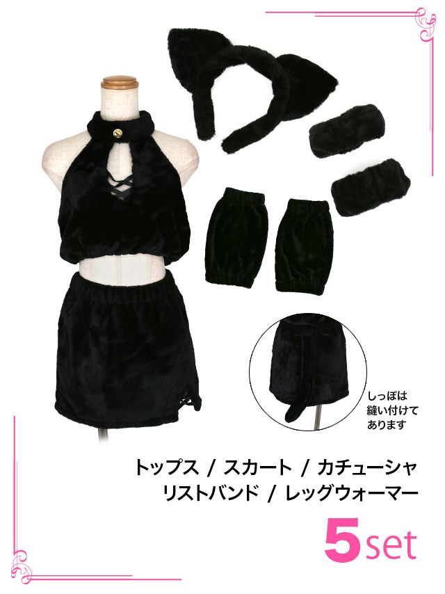 5. [セール]コスプレ ふわもこホルターネックへそ出しタイトミニスカートセットアップセクシー黒猫アニマル [5点セット] (トップス/スカート/カチューシャ/リストバンド/レッグウォーマー)