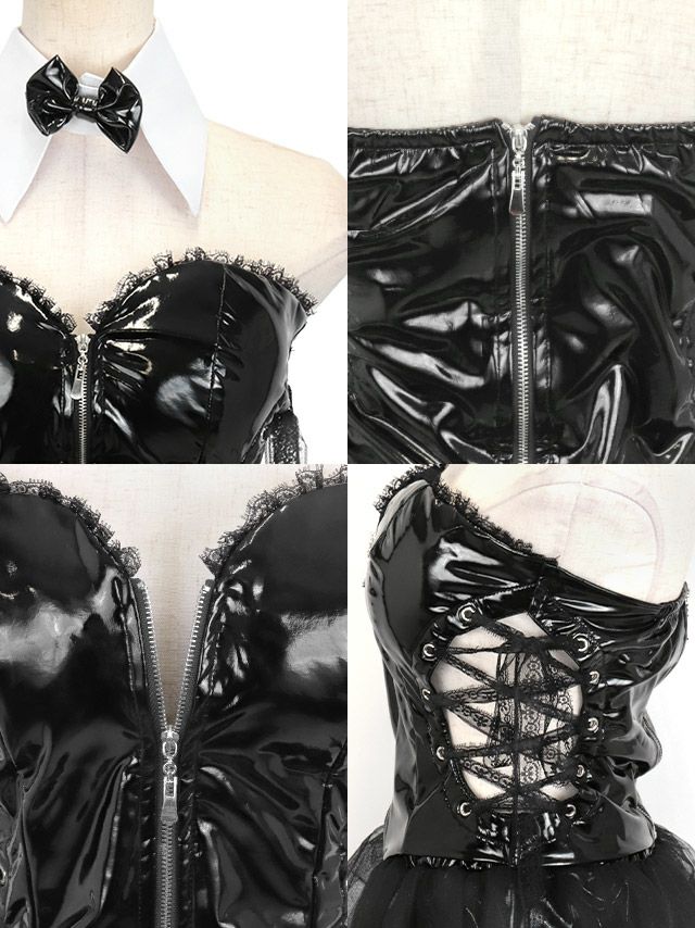 コスプレ エナメルレースアップフロントジップベアトップフレアスカートセクシーペアバニーアニマルのディティール