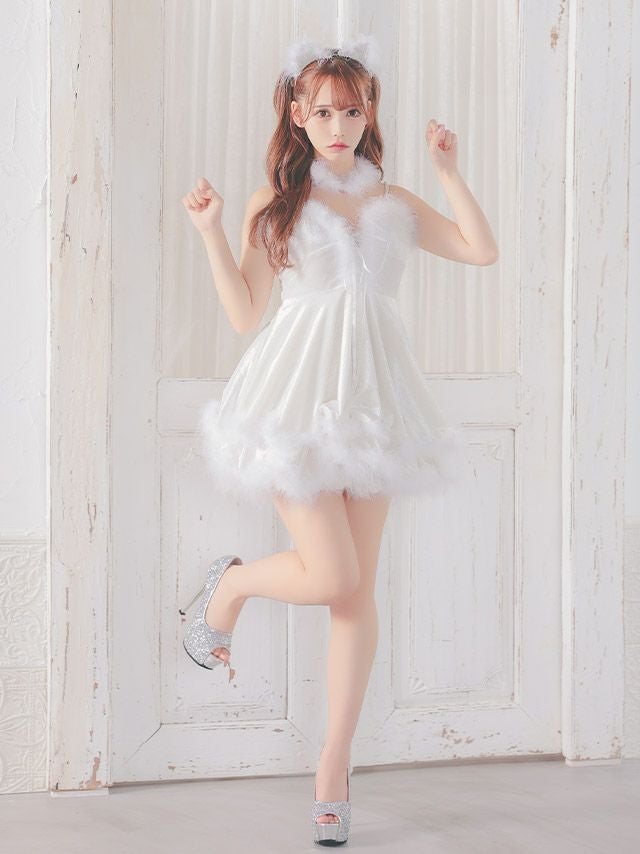 4. [セール]コスプレ ふわふわフェザー体型カバーフレアスカートペアガーリー白猫アニマル [3点セット] (ワンピース/チョーカー/カチューシャ)(S~L)