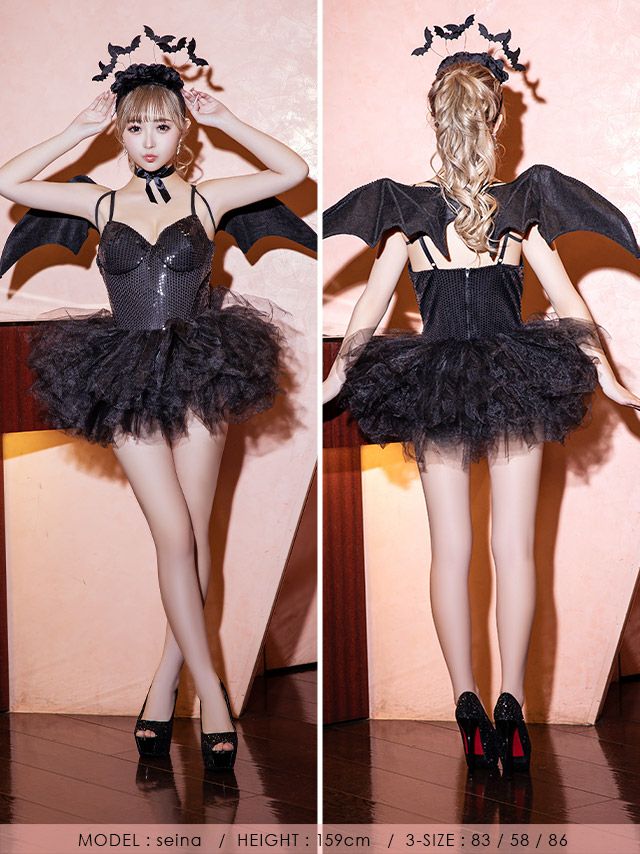 4. コスプレ セクシースパンコール付きツインフレアスカートバットデビル [5点セット] (レオタード/パニエ/カチューシャ/チョーカー/羽)