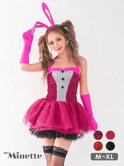 4. [セール]コスプレ ホルターネック リボン ラメ キラキラ ふわふわチュール スカ―ト オフショル プチプラ セクシー バニーガール [3点セット] (ワンピース/カチューシャ/手袋)(M~XL)