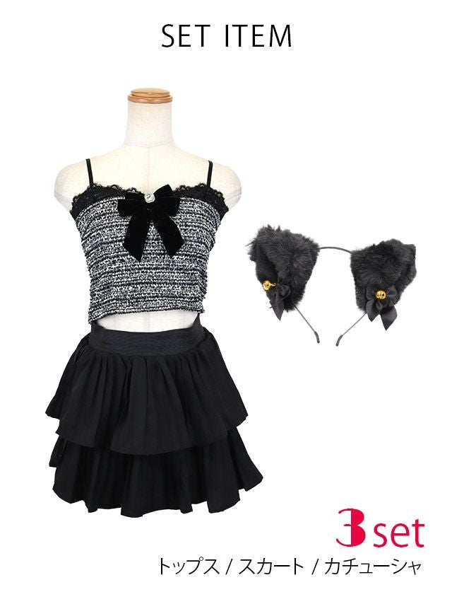 3. コスプレ リボン ツイード ミニスカ キャミソール プチプラ ガーリー ねこ[3点セット] (トップス/スカート/カチューシャ)(Mサイズ)