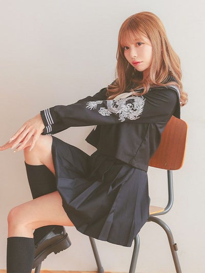 龍刺繍入り ミニ丈 体型カバー 袖あり プリーツ フレアスカート セーラー服のセット画像