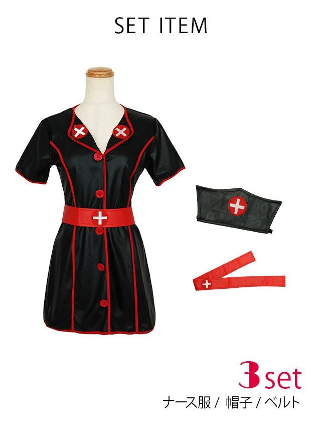[セール]コスプレ 4点set レザー調パイピングタイトミニブラックプチプラセクシーナース [ナース服+帽子+靴下+ベルト]