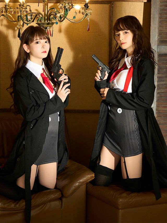 コスプレ ギャング袖ありツインマフィアポリス [6点セット] (コート/ワンピース/つけ襟/タイ/サスペンダー/透明ストラップ)