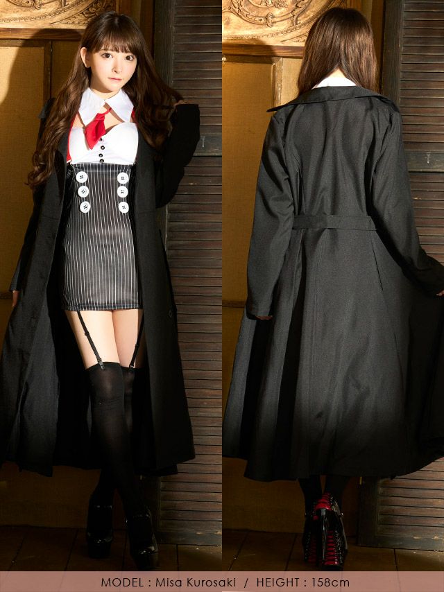 4. コスプレ ギャング袖ありツインマフィアポリス [6点セット] (コート/ワンピース/つけ襟/タイ/サスペンダー/透明ストラップ)