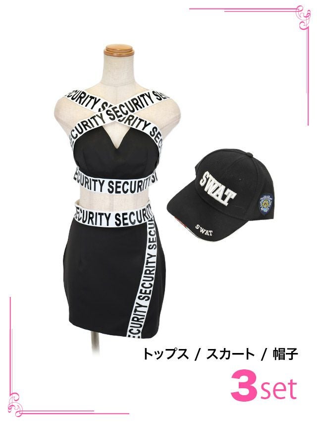 コスプレ スポーティーロゴテープへそ出しクロストップス×ミニスカセットアップセクシーSWATポリス [3点セット] (トップス/スカート/帽子)
