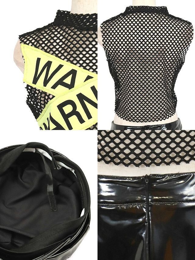 4. コスプレ セクシーメッシュクロステープデザインレザータイトマイクロミニスカートセットアップへそ出しSWATポリス [3点セット] (トップス/スカート/帽子)
