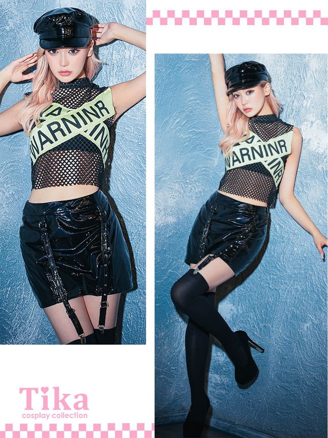 4. コスプレ セクシーメッシュテープデザインメタリックレザースカートセットアップへそ出しバリケードペアSWATポリス [3点セット] (トップス/スカート/帽子)