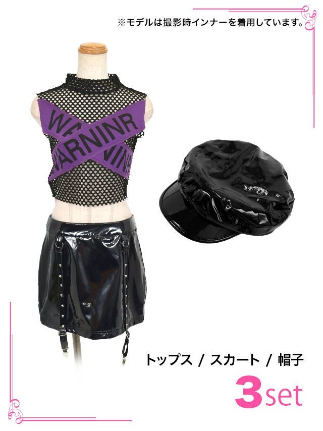 5. コスプレ セクシーメッシュテープデザインメタリックレザースカートセットアップへそ出しバリケードペアSWATポリス [3点セット] (トップス/スカート/帽子)