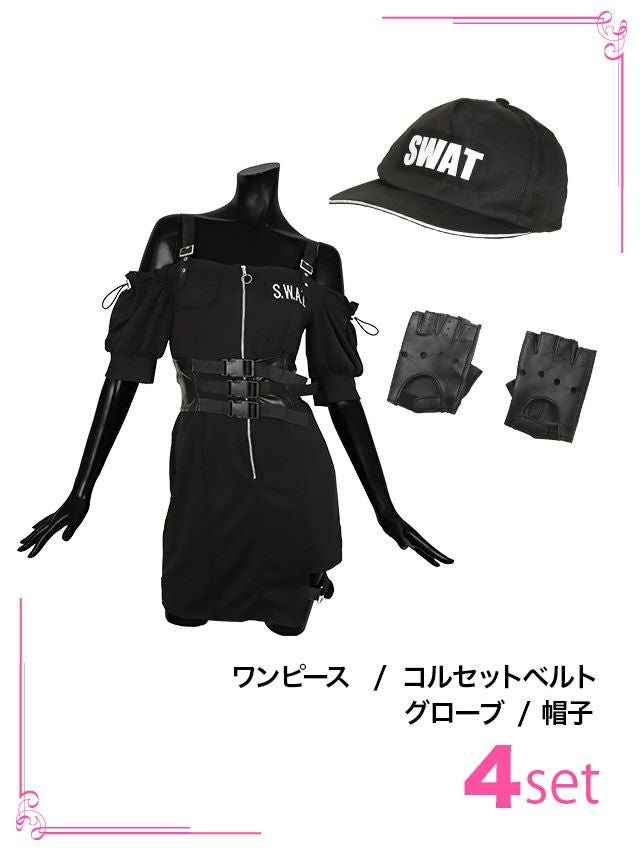4. [セール][再入荷]コスプレ ショルダーカットフロントジップ体型カバーペアガーリーSWATポリス [4点セット] (ワンピース/コルセットベルト/グローブ/帽子)