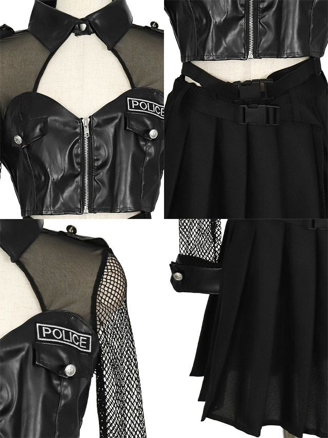 4. コスプレ 長袖メッシュバストカットアウトへそ出しセクシーポリス [5点セット] (トップス/スカート/パンツ/ベルト/帽子)