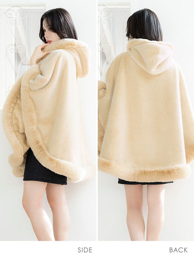 4. [アウトレット] フードもこもこフェイクファーデザイン大判ケープショール (せいせい/羽織り着用)