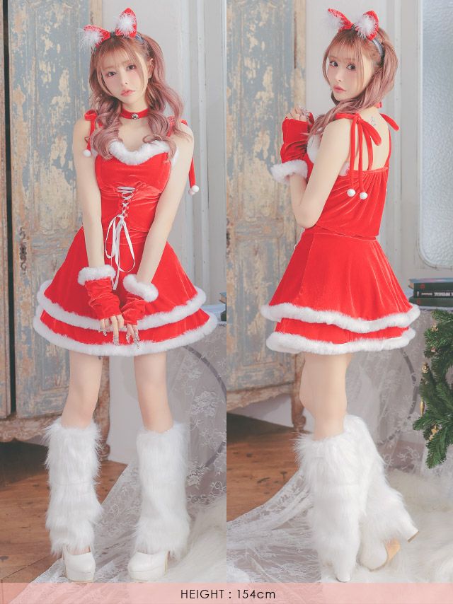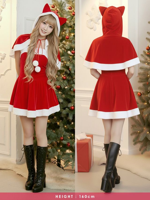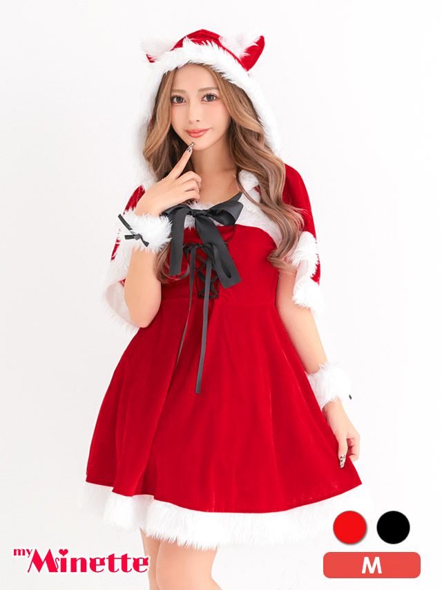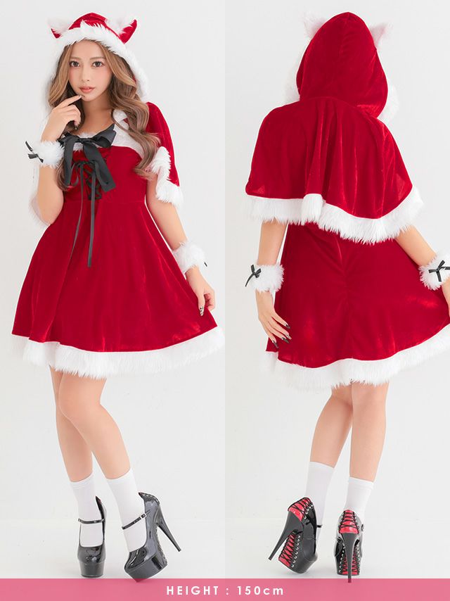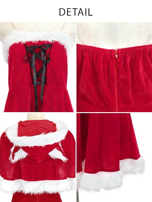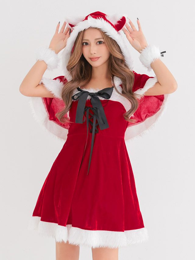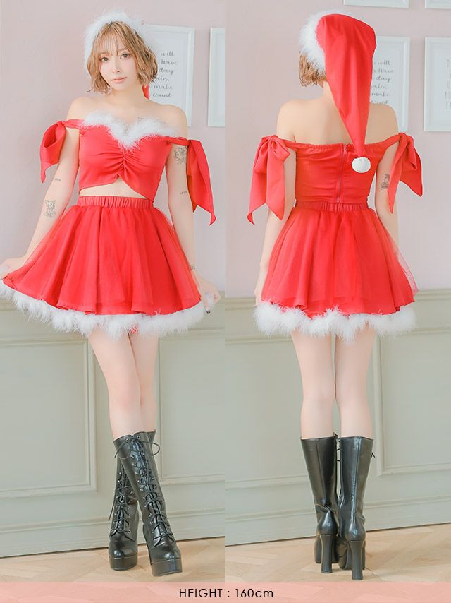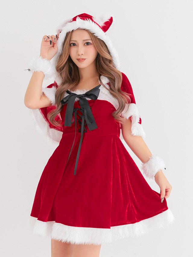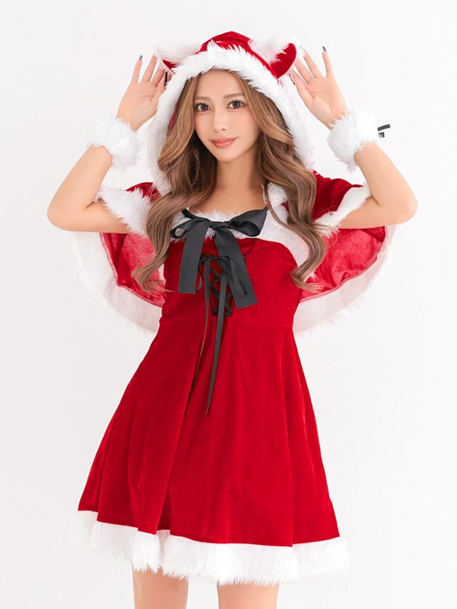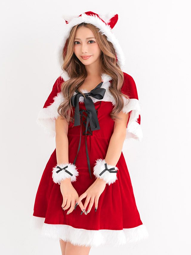 サンタ&トナカイ サンタコス セットアップ ねこ耳ケープ フレア ふわふわ トナカイ オフショル コスプレ
