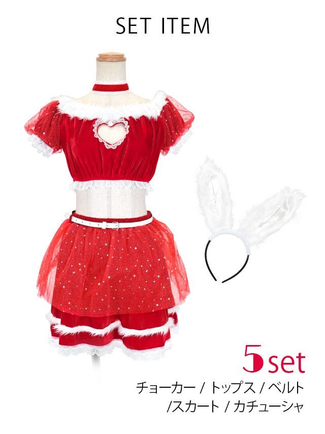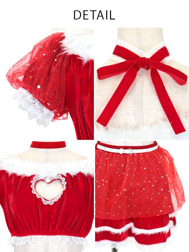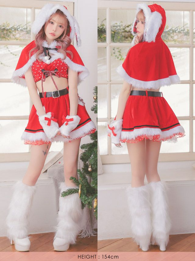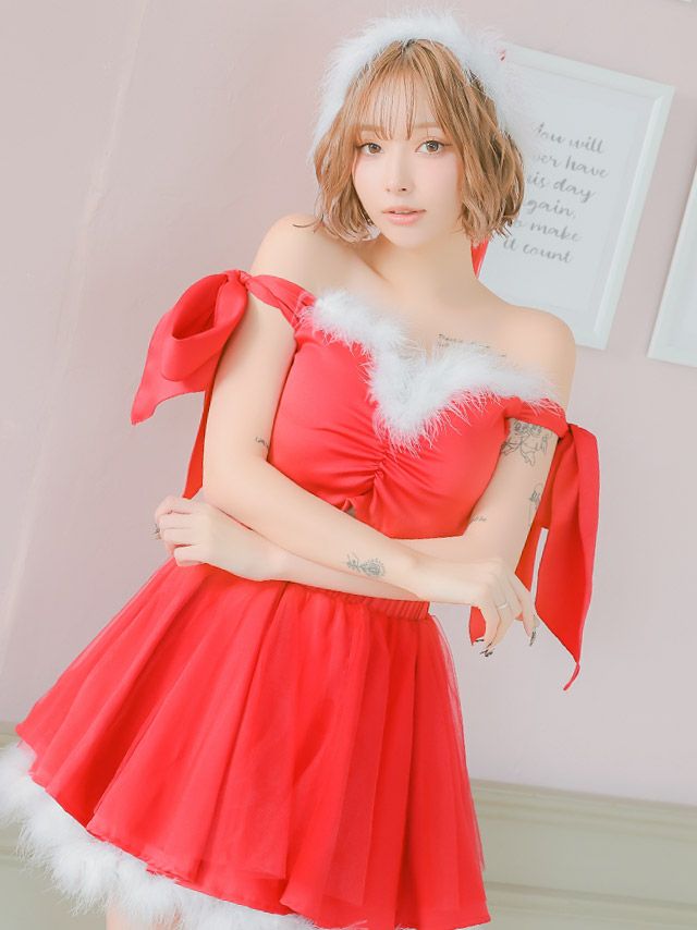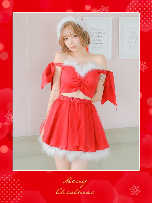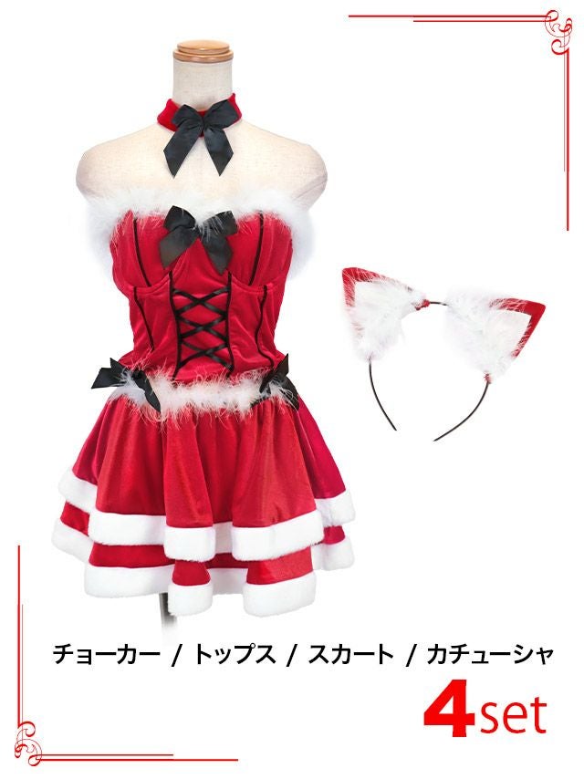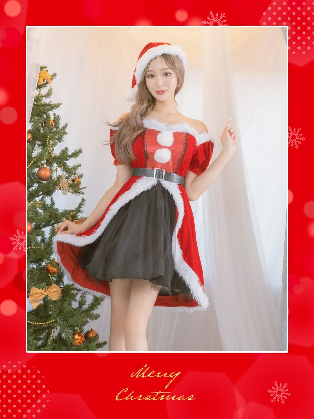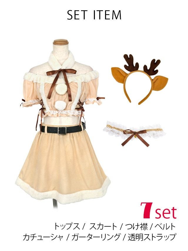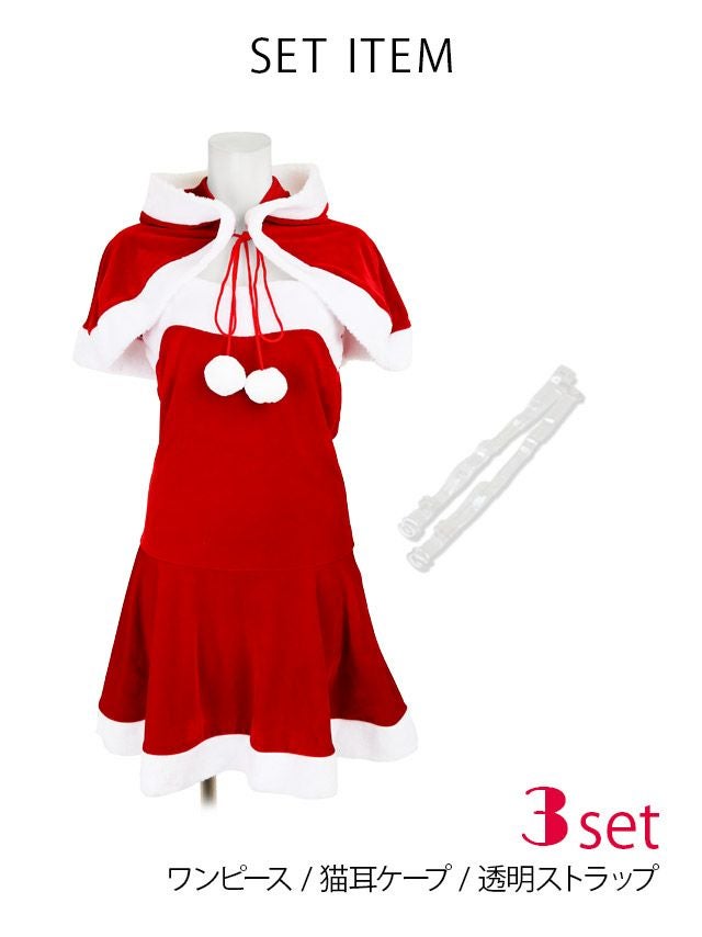 [新作]サンタコス 7点set ふわふわ トナカイ オフショル セットアップ ねこ耳ケープ フレア コスプレ [カチューシャ+付け襟+トップス+透明ストラップ+スカート+ベルト+ガーターリング]