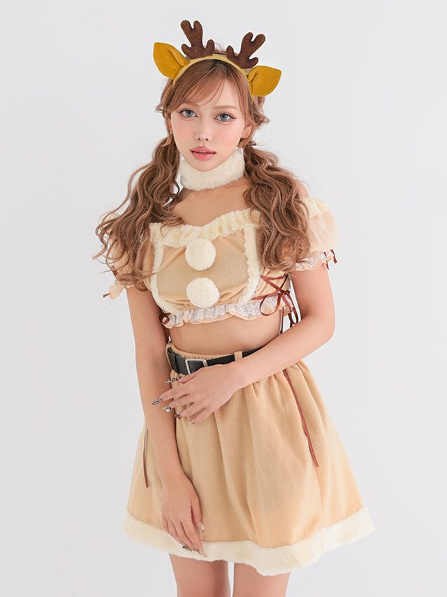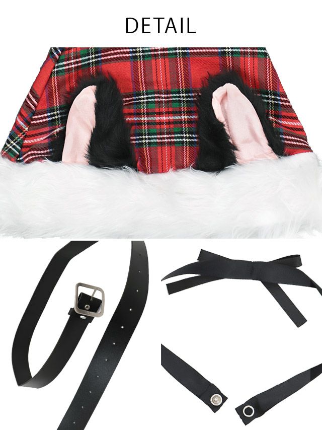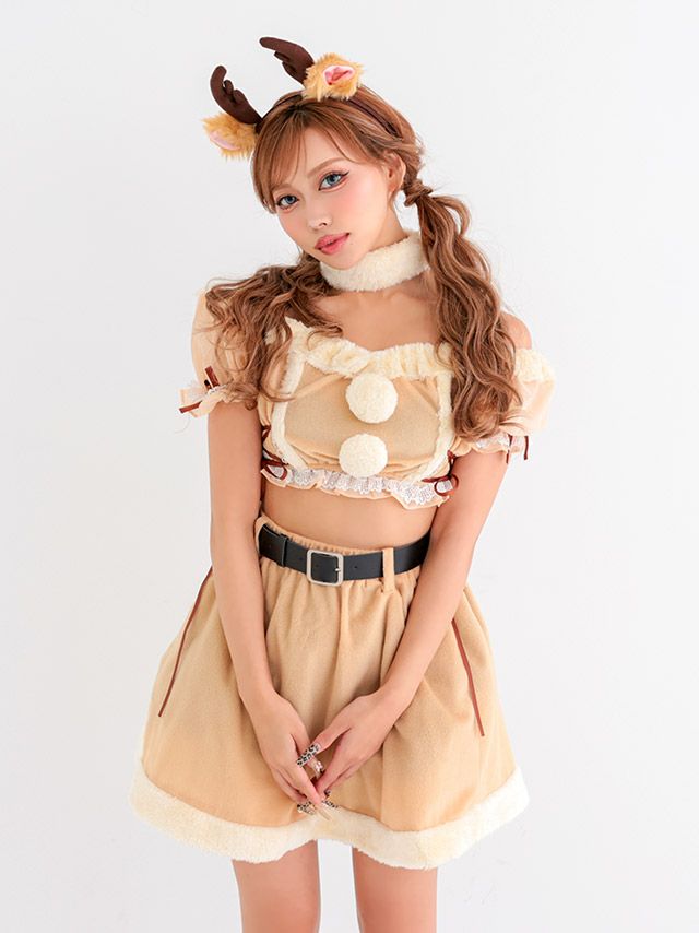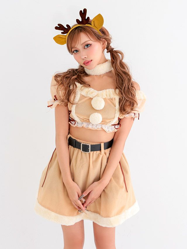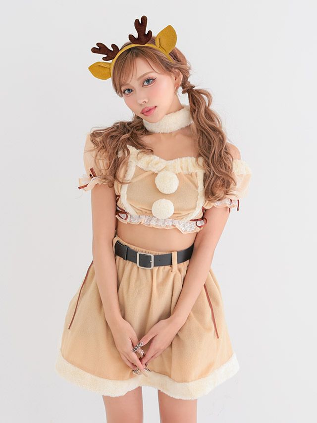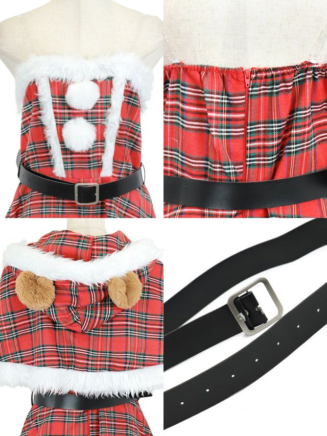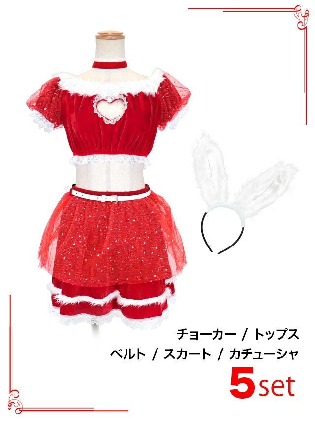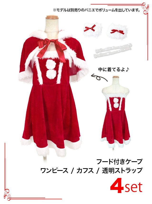 [新作]サンタコス 7点set ふわふわ トナカイ オフショル セットアップ ねこ耳ケープ フレア コスプレ [カチューシャ+付け襟+トップス+透明ストラップ+スカート+ベルト+ガーターリング]