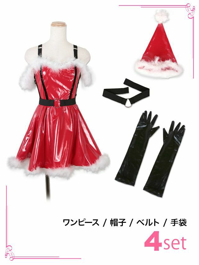 サンタコス 4点set メタリック×ファーAライン サンタ コスプレ [ワンピース+帽子+ベルト+手袋]