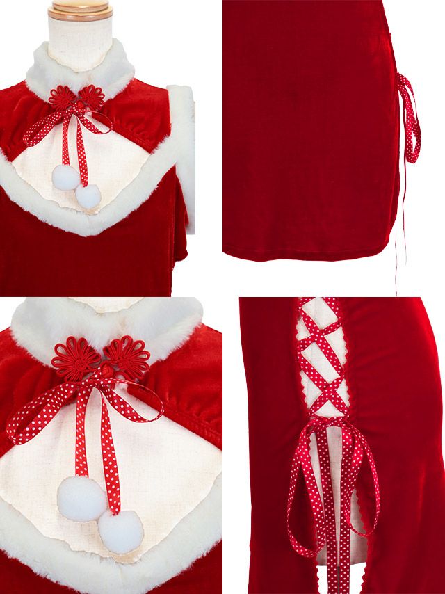 サンタコス 3点set サイドドット柄レースアップベロアプチプラサンタコスプレドレス