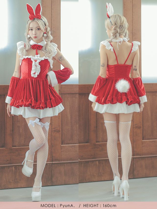 6. サンタコス 6点set しっぽ付きハートリボンバニーガール サンタ コスプレ [ワンピース+チョーカー+カチューシャ+アームウォーマー+インナースカート+しっぽ] (M)(ぴょな着用)