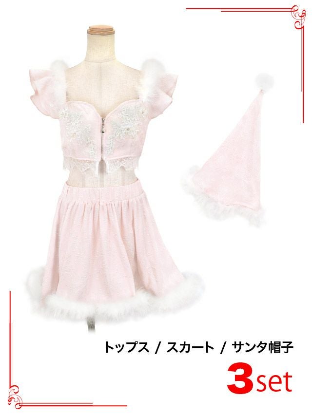 サンタコス 3点set フリルショルダー刺繍デザインAラインセパレートふわふわファー サンタ コスプレ [トップス+スカート+サンタ帽子]