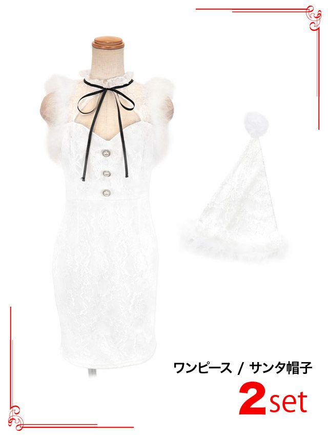 サンタコス 2点set パールボタン付き総レースハイネックリボンタイト サンタ コスプレ ドレス [ワンピース+サンタ帽子]