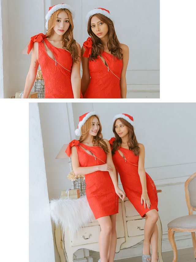 4. サンタコス 2点set リボン付きワンショルダータイトシースルーフラワーレース サンタ コスプレ [ワンピース+サンタ帽子](S~L)