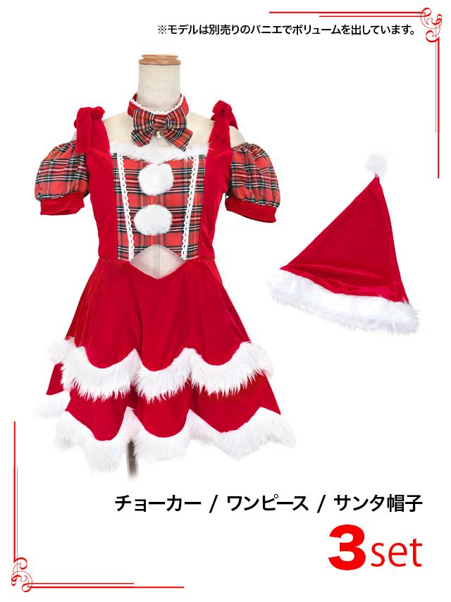 サンタコス 3点set タータンチェックオフショルスカラップふわふわファーフレアスカート王道 サンタ コスプレ [チョーカー+ワンピース+サンタ帽子]