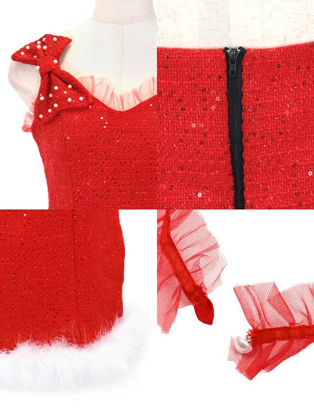 5. サンタコス 3点set ガーリーリボン付きキラキラツイード サンタ コスプレ [ワンピース+サンタ帽子+ガーターリング]