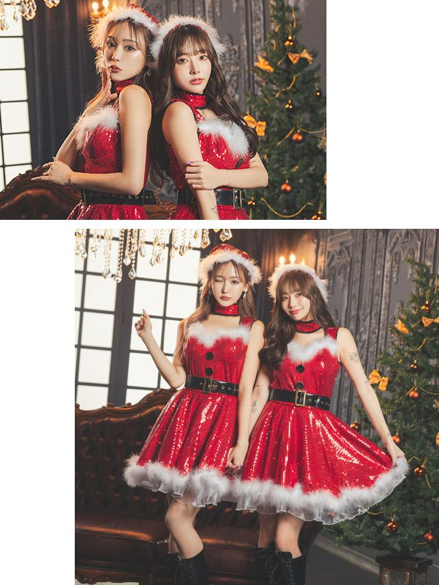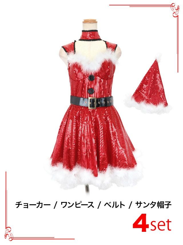 サンタコス 4点set ふわふわフェイクフェザー&総スパンコールゴージャスフレアキラキラ王道 サンタ コスプレ [チョーカー+ワンピース+ベルト+サンタ帽子]