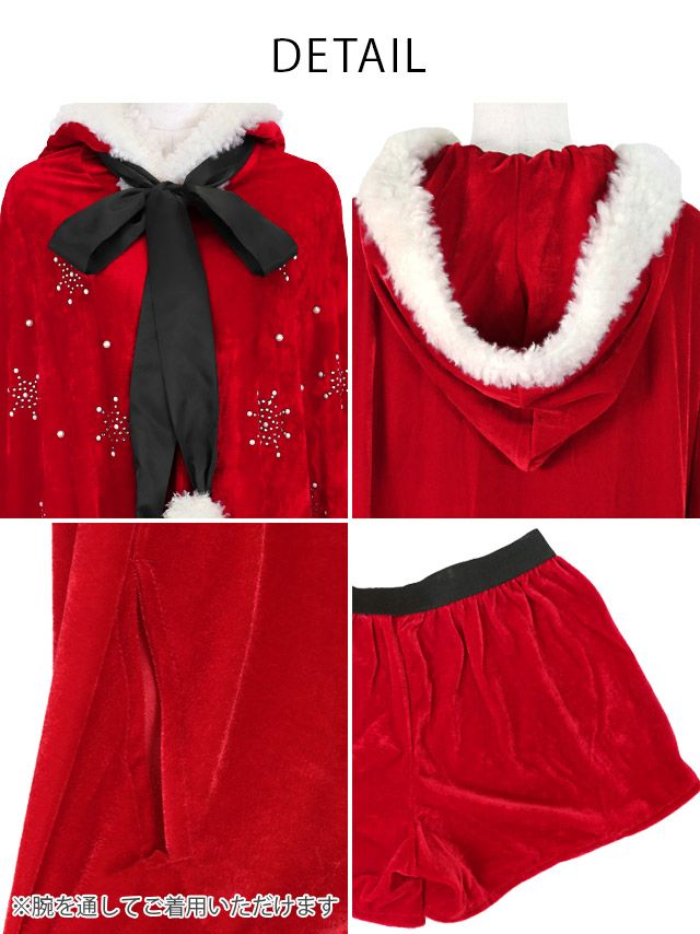 4. [再入荷]サンタコス 3点set フード付き ふわふわポンチョ クリスタルビジュー デザイン サンタ コスプレ [ポンチョ+リボンタイ+ショートパンツ]