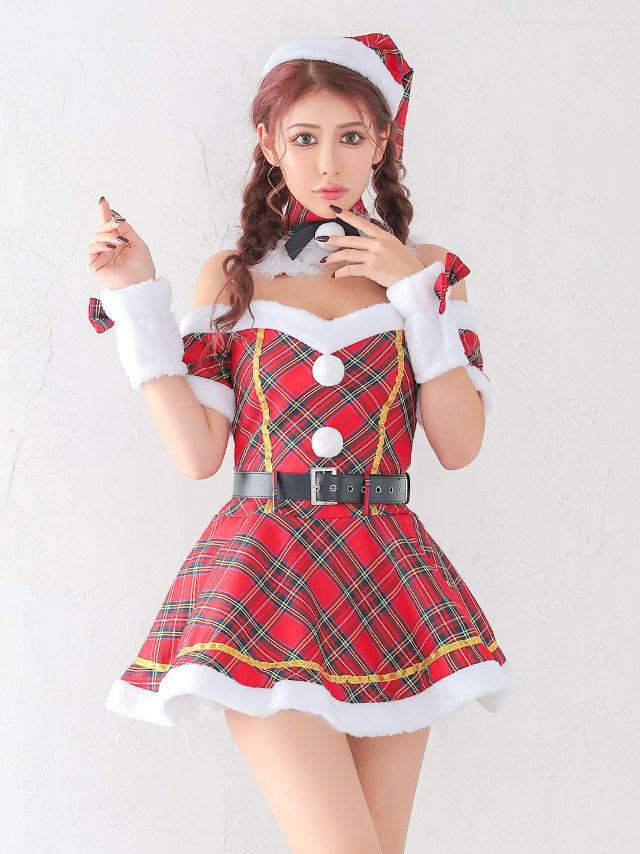 [新作]サンタコス 5点set ふわふわガーリーチェック サンタ コスプレ [ワンピース+サンタ帽子+つけ襟+アームアクセ+ベルト](Mサイズ)