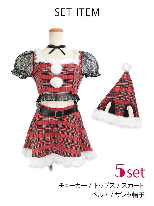 サンタコス 5点set レース フリル タータンチェック柄 セパレート ふわふわ Aライン 猫アニマル サンタ コスプレのセット内容