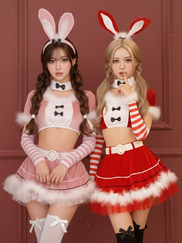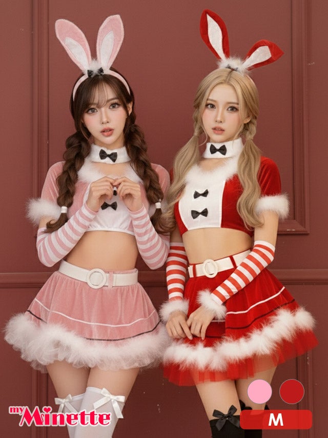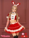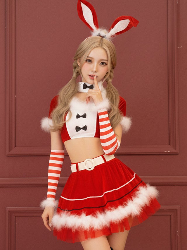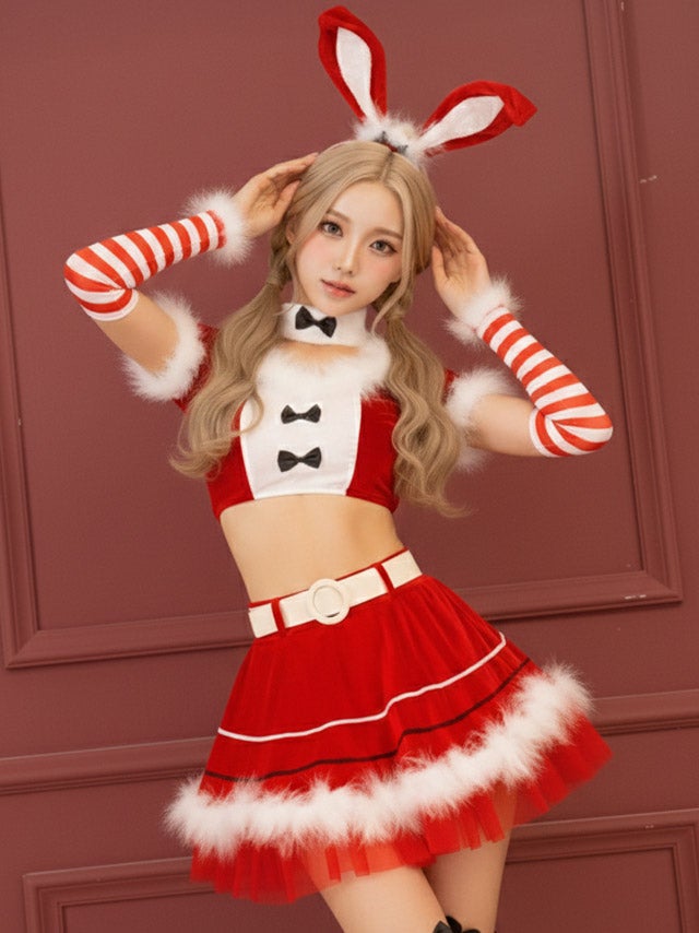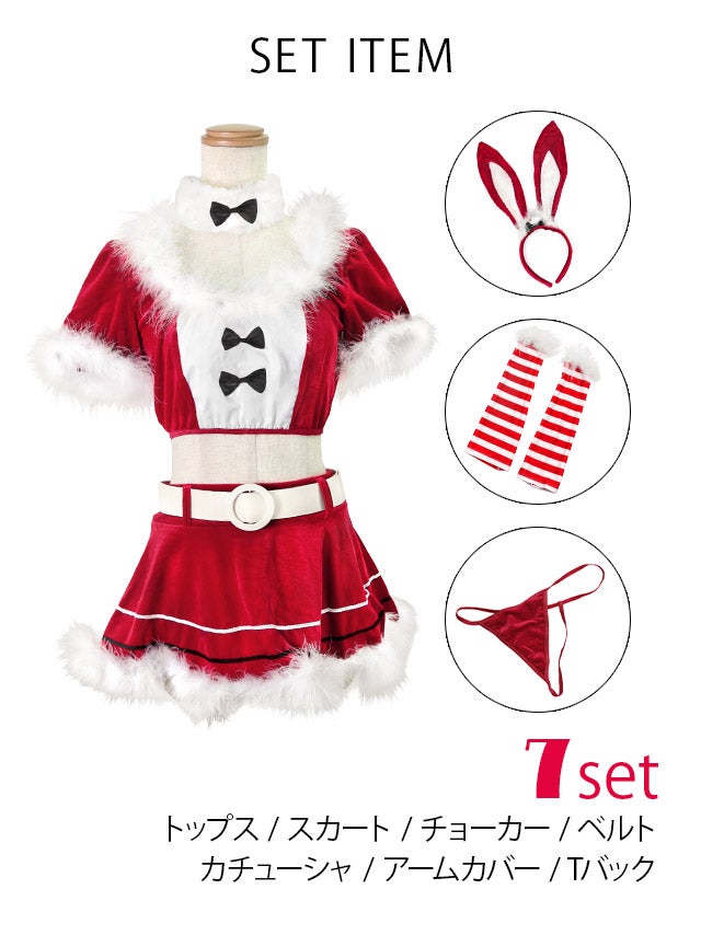 [再入荷]サンタコス 7点set ふわふわサンタバニーガール サンタ コスプレ [トップス+スカート+チョーカー+ベルト+カチューシャ+アームカバー+Tバック]