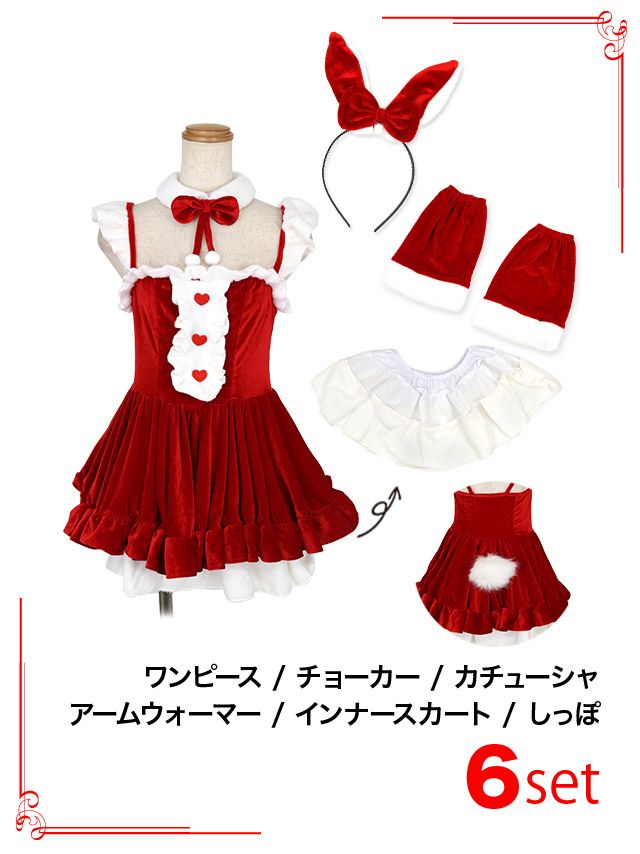 サンタコス 6点set しっぽ付きハートリボンバニーガール サンタ コスプレ [ワンピース+チョーカー+カチューシャ+アームウォーマー+インナースカート+しっぽ] (M)(ぴょな着用)