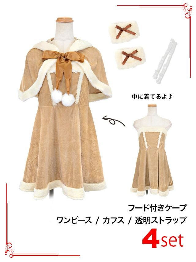 4. [再入荷]サンタコス 4点set ベアトップミニワンピ&ツノ付きケープふわふわボアトナカイアニマル サンタ コスプレ [フード付きケープ+ワンピース+カフス+透明ストラップ]
