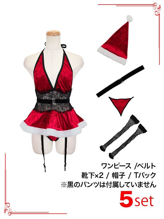 5. サンタコス 5点set ホルターネックベルト付きウエストブラックレースプチプラ サンタ コスプレ [ワンピース/ベルト/靴下×2/サンタ帽子+Tバック]