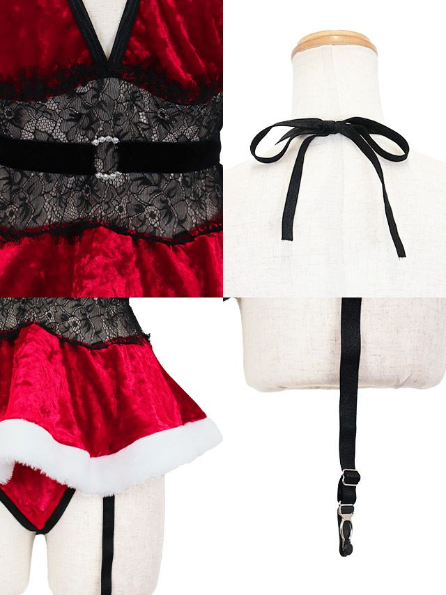 4. サンタコス 5点set ホルターネックベルト付きウエストブラックレースプチプラ サンタ コスプレ [ワンピース/ベルト/靴下×2/サンタ帽子+Tバック]