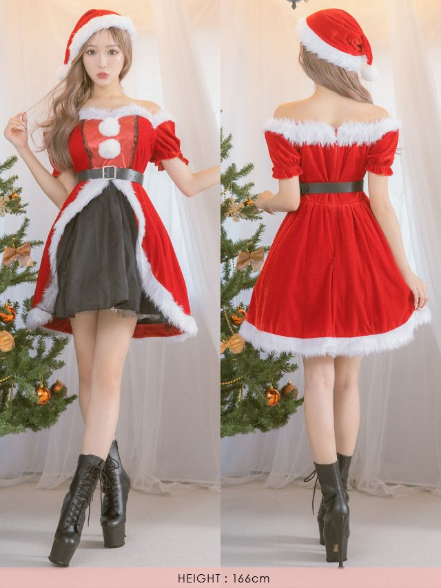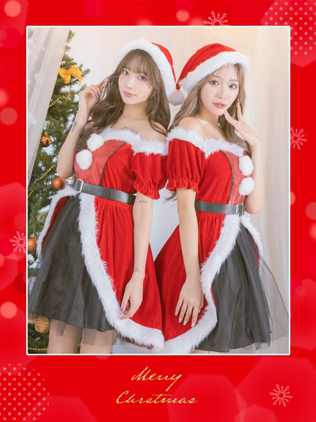 サンタコス 4点set フロントブラックチュールフリルデザインオフショルダー王道サンタコスプレ