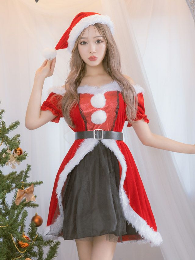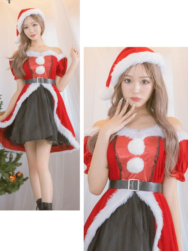 サンタコス 4点set フロントブラックふわふわチュールフリルデザインオフショルダー王道 サンタ コスプレ [ワンピース+ベルト+サンタ帽子+透明ストラップ]