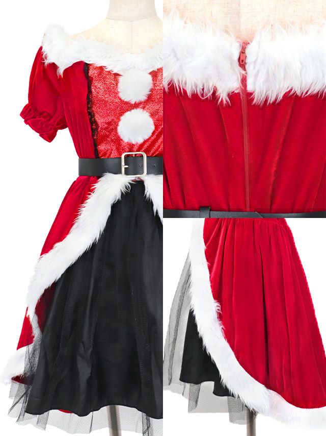 4. サンタコス 4点set フロントブラックふわふわチュールフリルデザインオフショルダー王道 サンタ コスプレ [ワンピース+ベルト+サンタ帽子+透明ストラップ]