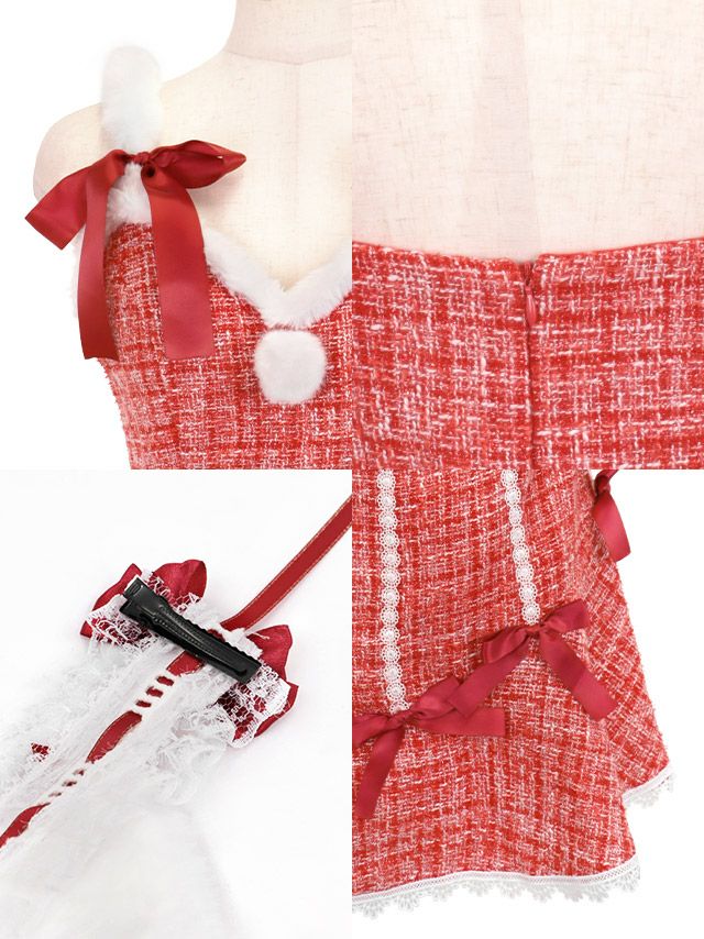 サンタコス 2点set ガーリーリボンツイードミックスレースウエストカットフレアスカートペア猫アニマルサンタコスプレドレスのディティール1枚目
