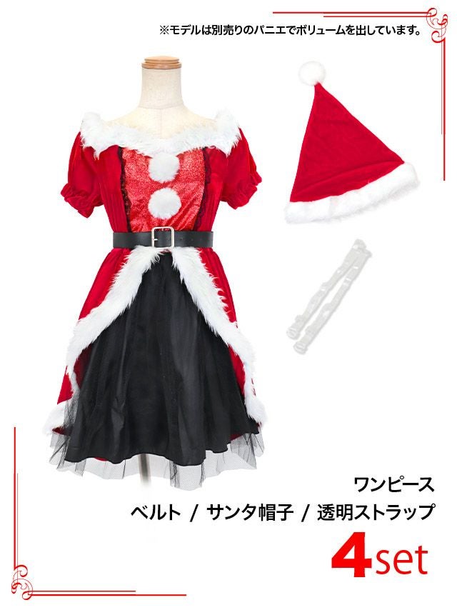 5. サンタコス 4点set 肩出し2WayオフショルダーキラキラAラインベロア サンタ コスプレ [帽子+ワンピース+透明ストラップ+ベルト]