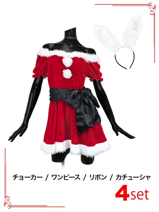サンタコス 4点set ビッグサテンリボンベルト付きオフショルファーバニーアニマルサンタコスプレ