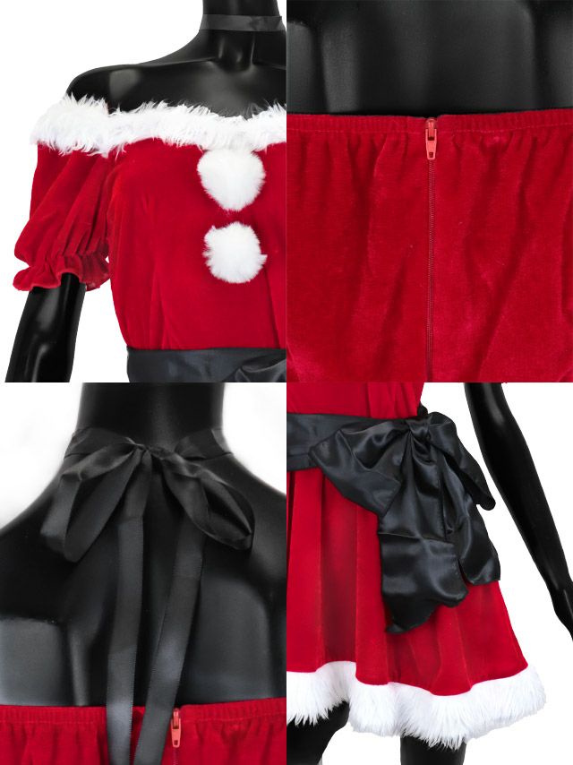 6. サンタコス 4点set ビッグサテンリボンベルト付きオフショルふわふわファーバニーアニマル サンタ コスプレ [チョーカー+ワンピース+リボン+カチューシャ]
